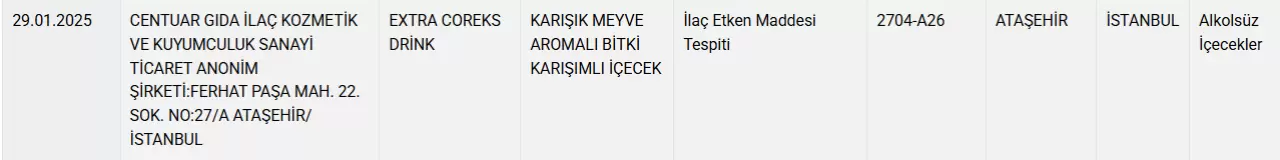 Centuar Gıda İlaç ve Kozmetik firmasının “Extra Coreks Drink” marka “karışık meyve aromalı bitki karışımlı” içeceğinde yasak olan madde kullanıldığı ortaya çıktı. Firma içecekte ilaç etken maddesi kullandı.