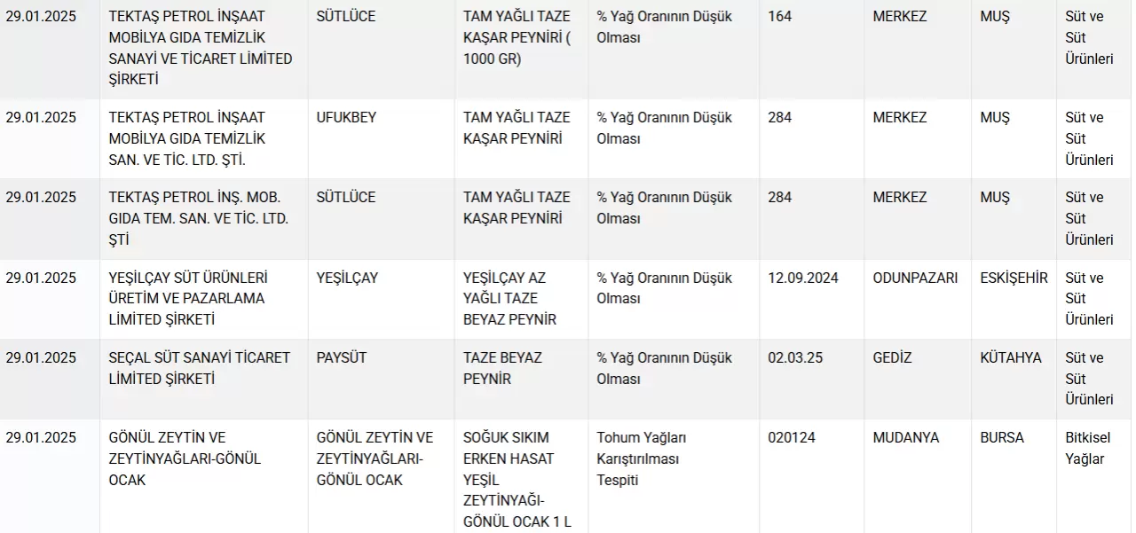 Muş merkezli Tektaş firmasının tam yağlı taze kaşar peynirlerinde tağşiş yaptığı anlaşıldı. Firmanın Sütlüce marka iki farklı peyniri ile Ufukbey marka peynirinde yağ oranının düşük olduğu belirlendi.