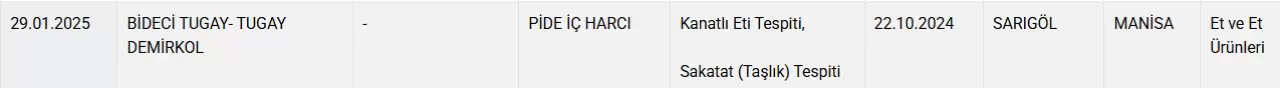 29.01.2025 BİDECİ TUGAY- TUGAY DEMİRKOL - PİDE İÇ HARCI Kanatlı Eti Tespiti, Sakatat (Taşlık) Tespiti 22.10.2024 SARIGÖL MANİSA Et ve Et Ürünleri