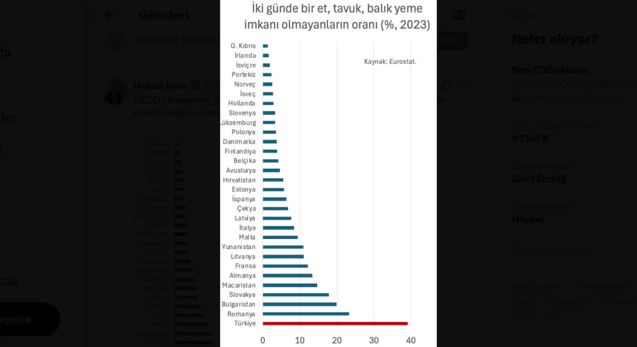 Kara’nın paylaştığı verilere göre, Türkiye’de 2014’e kadar düzenli protein tüketiminde iyileşme yaşanırken, 2018-2022 döneminde tablo yeniden bozuldu. 2023 itibarıyla ise halkın yaklaşık yüzde 40’ı gün aşırı et, tavuk veya balığa erişemedi.