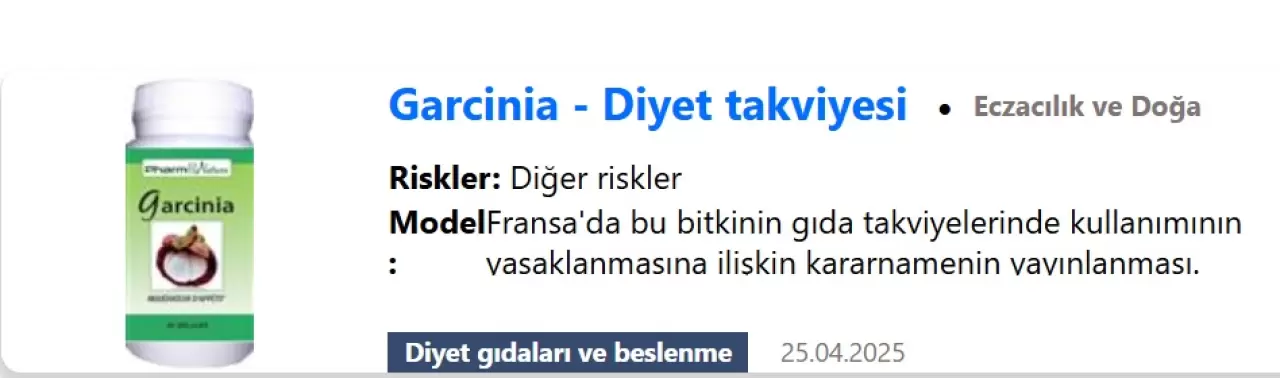 Hindistan ve Güneydoğu Asya’da yetişen ve balkabağına benzeyen Garcinia cambogia bitkisinin tıbbi amaçlı kullanımı Fransa'da 2012 yılından bu yana yasak. Fransa’da Garcinia cambogia içeren bir gıda takviyesi kullanan 71 yaşındaki yaşındaki kadının akut hepatit nedeniyle ölümü sonrası, bu bitkinin ekstratının kullanılmamasına yönelik uzmanlar uyarılarda bulundu.