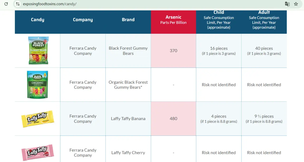Florida Sağlık Bakanlığı tarafından yayımlanan raporda, bazı şekerleme ve çikolataların düzenli tüketiminin, yıllık güvenli arsenik maruziyet sınırlarının aşılmasına neden olunacağını belirtiyor