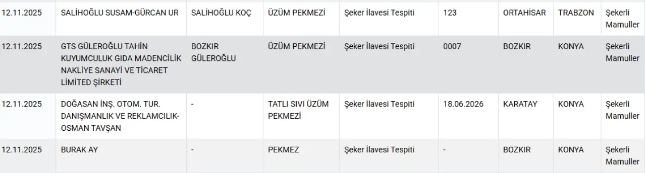 Benzer biçimde, Konya Bozkır ilçesinde üretim yapan GTS Güleroğlu Tahin Kuyumculuk Gıda Madencilik Nakliye San. ve Tic. Ltd. Şti. tarafından üretilen “Bozkır Güleroğlu Üzüm Pekmezi” de aynı ihlalle bakanlık listesine girdi.