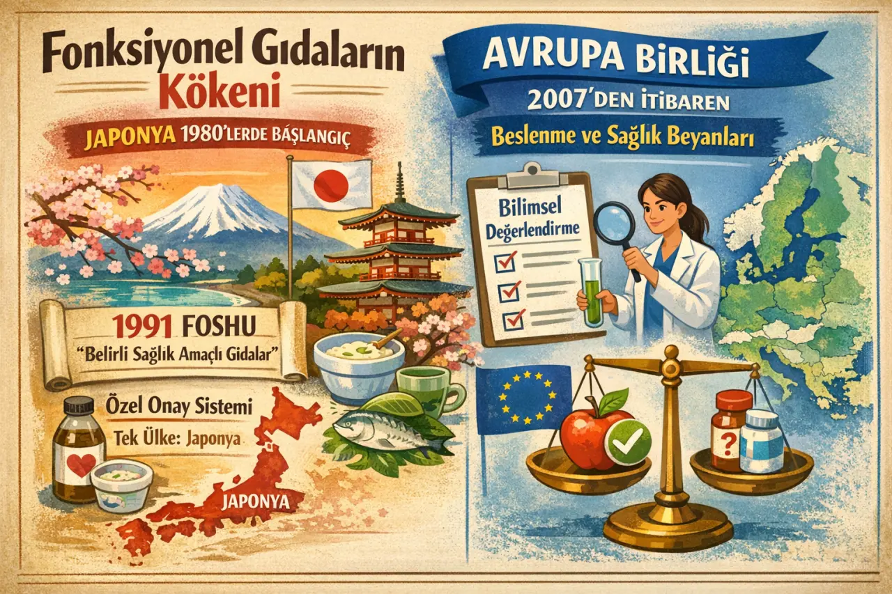 Fonksiyonel gıdalar kavramı ilk kez 1980’li yıllarda Japonya’da ortaya çıktı. 1991 yılında “Belirli Sağlık Amaçlı Gıdalar” anlamına gelen FOSHU sistemiyle Japonya, bu ürünler için özel bir onay mekanizması kuran ilk ülke oldu. Bugün Japonya, fonksiyonel gıdaları ayrı bir kategori olarak tanıyan dünyadaki tek ülke konumunda bulunuyor. Avrupa Birliği’nde ise 2007 yılından bu yana beslenme ve sağlık beyanları sıkı bir bilimsel değerlendirmeye tabi tutuluyor.