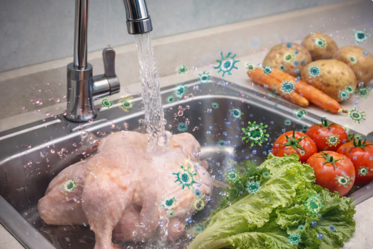 Asıl risk burada başlıyor. Çiğ tavukta bulunabilen Salmonella ve Campylobacter gibi bakteriler, yıkama sırasında suyla birlikte gözle görünmeyen mikro damlacıklar halinde lavaboya, tezgâha, süngere, musluğa ve hatta yakındaki sebzelere sıçrayabiliyor.