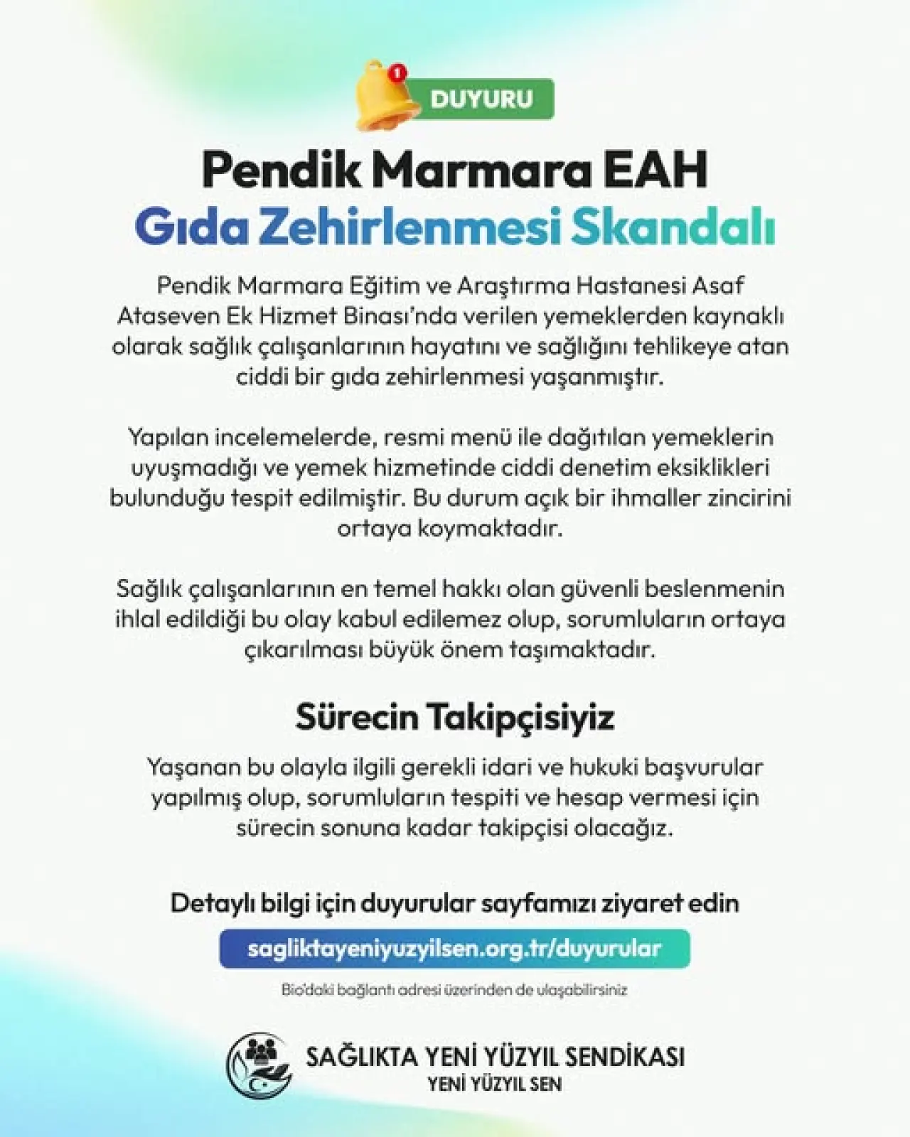 Sağlıkta Yeni Yüzyıl Sendikası Genel Başkanı Salim Kar, Pendik’te bulunan Marmara Üniversitesi Pendik Eğitim ve Araştırma Hastanesi Prof. Dr. Asaf Ataseven Ek Hizmet Binası’nda yaşandığı iddia edilen gıda zehirlenmesi vakalarına ilişkin Gıda Bülteni’ne özel açıklamalarda bulundu. Kar, olayın planlanan yemek programının dışına çıkılması ve kullanılan ürünlerin kalitesiz olması nedeniyle meydana geldiğini öne sürdü.