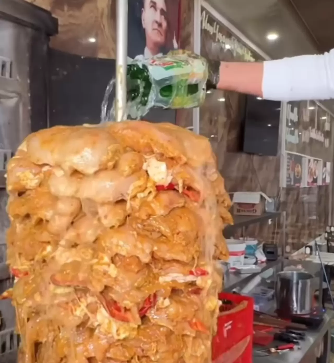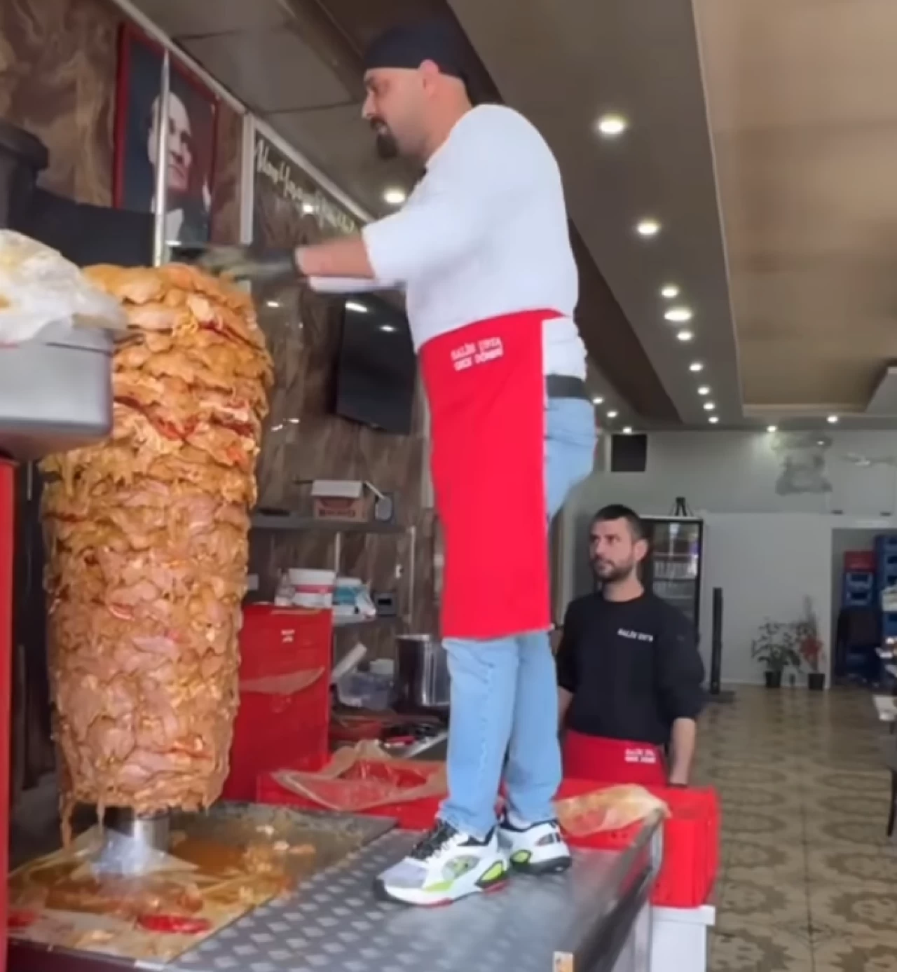 Videoda döner ustası ayakkabılarıyla döner tezgahına çıkıyor ve dönere soda döküyor.