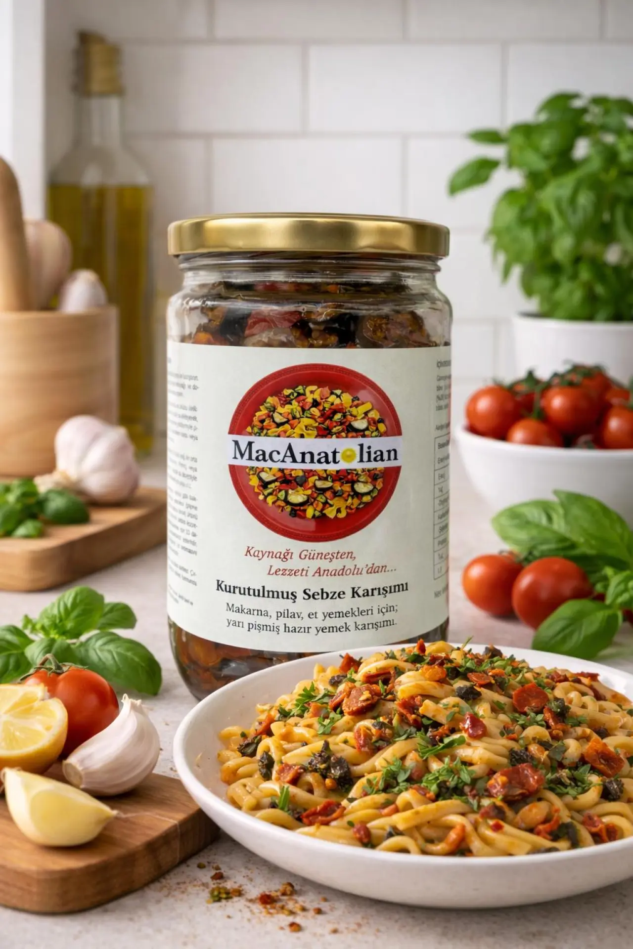 Patlıcanlı kurutulmuş sebze karışımı: Marine edilmiş yapısıyla et yemeklerinden makarnaya kadar geniş bir kullanım alanı sunuyor.